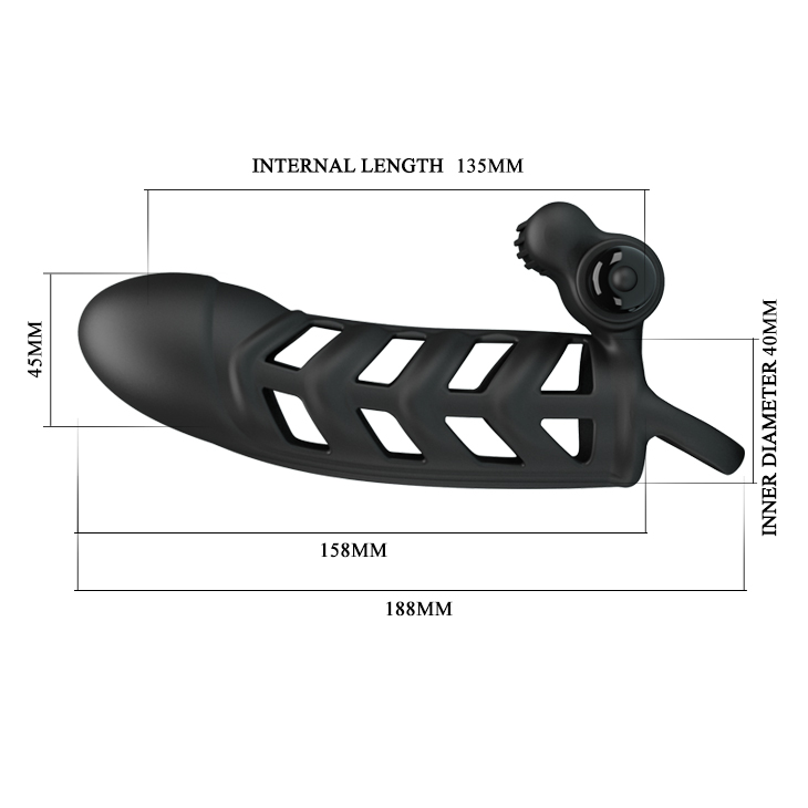 Silikonska navlaka za penis sa prstenom za testise i dodatkom za klitoralnu stimulaciju sa vibracijom prilikom odnosa.Ukupne dužine 18,5cm i prečnika 4,5cm.Može se koristiti sa lubrikantom.